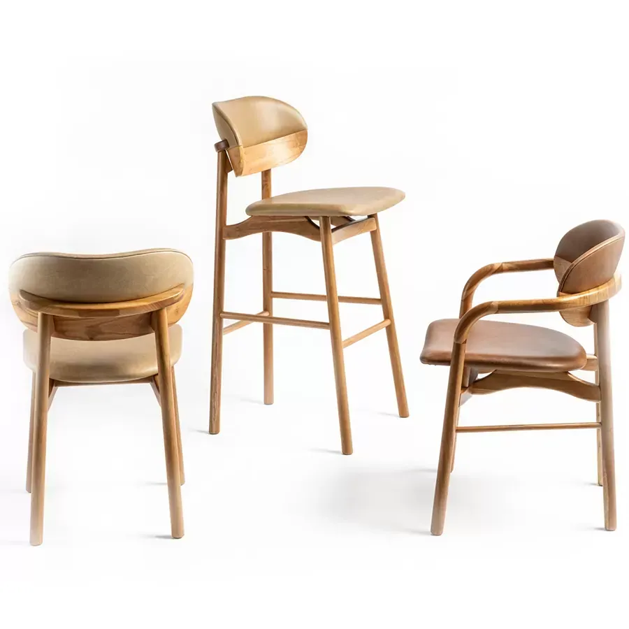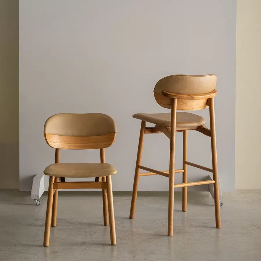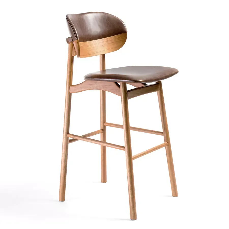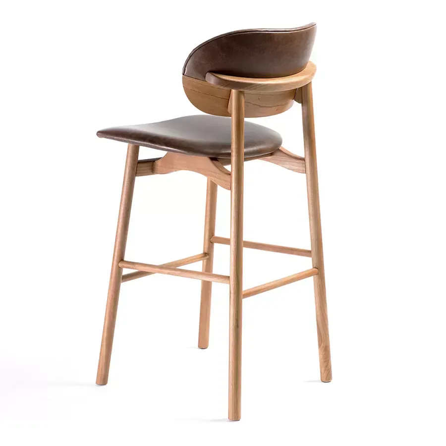 A banqueta Grão é ideal para bancadas, cozinhas ou espaços gourmet. Seu espaldar bipartido remete a um grão de café, revestido em madeira laminada e couro. De estrutura torneada, se destaca pelo seu assento anatômico que provoca a sensação de flutuação.