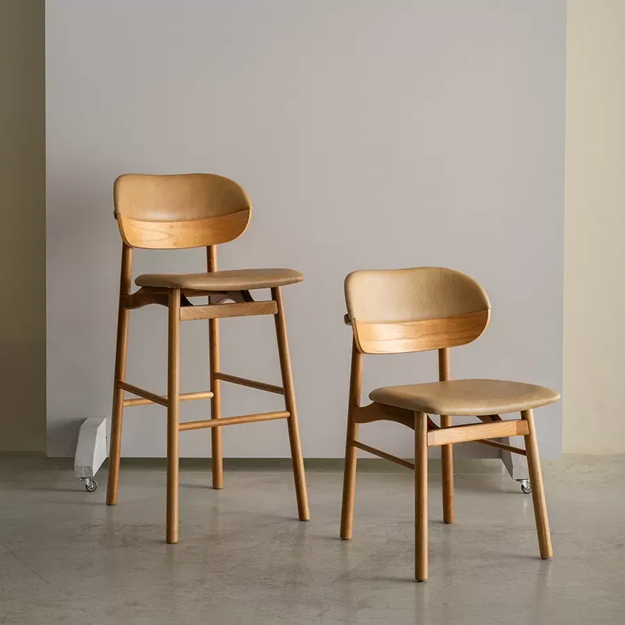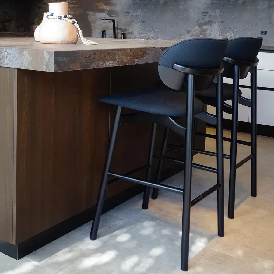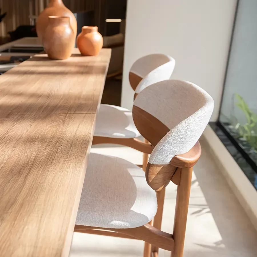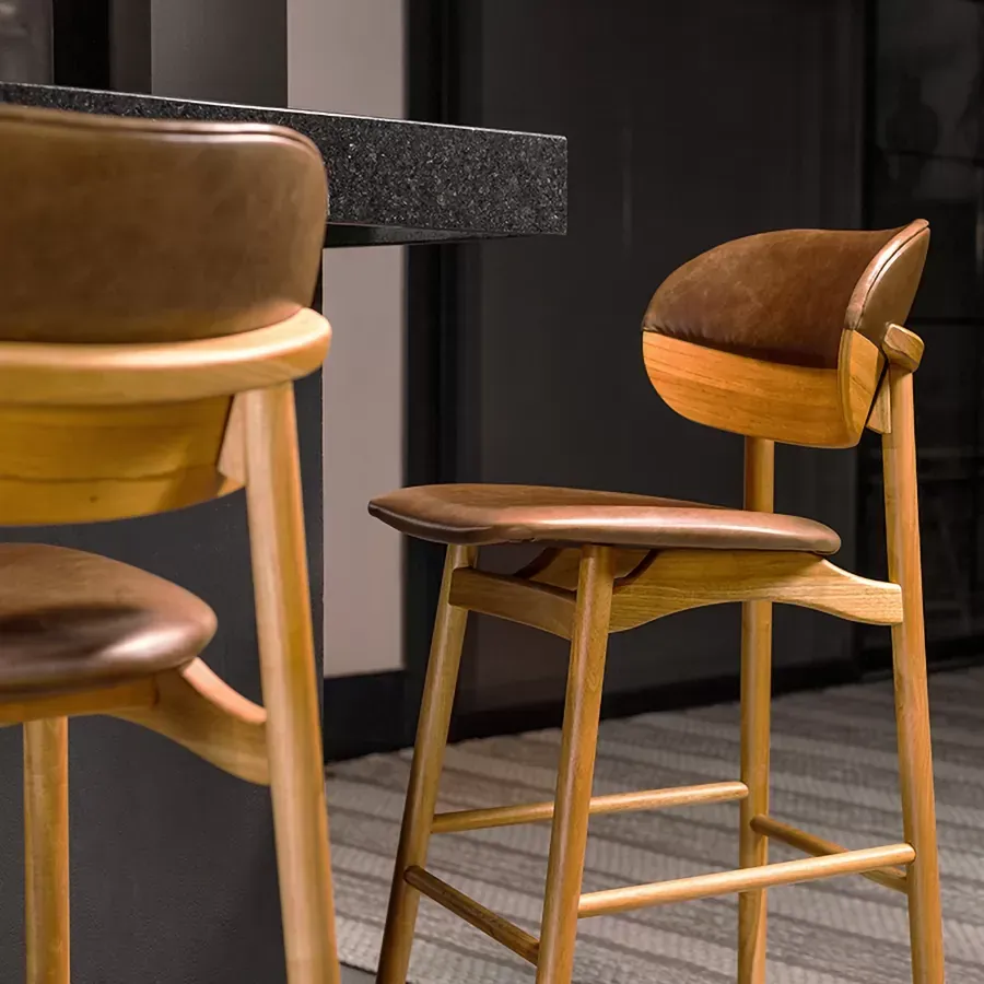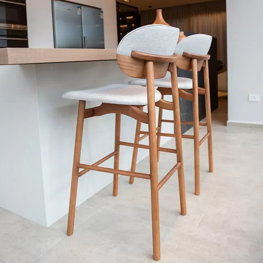 A banqueta Grão é ideal para bancadas, cozinhas ou espaços gourmet. Seu espaldar bipartido remete a um grão de café, revestido em madeira laminada e couro. De estrutura torneada, se destaca pelo seu assento anatômico que provoca a sensação de flutuação.