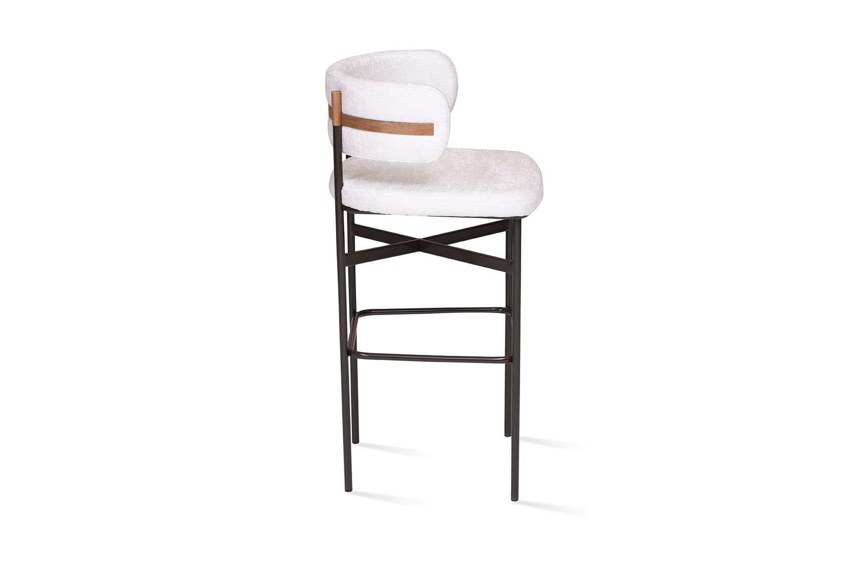 Estrutura em aço carbono pintada. Assento estofado. Encosto detalhe faixa couro. Ponteiras revestidas em couro.