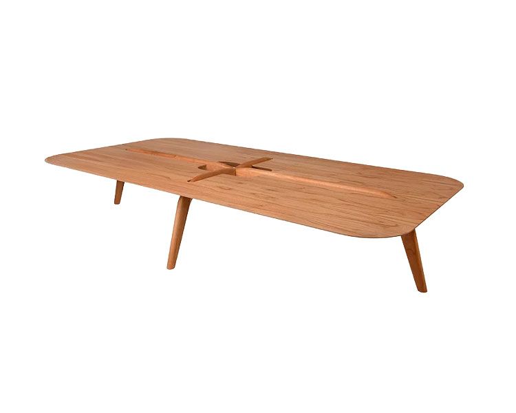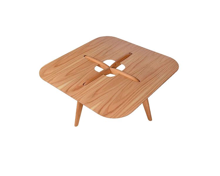 Delicadas e sutis, as mesas de centro são compactas e exploram o universo dos alinhavos em duas cores distintas. A madeira dos pés, é tratada como um fio costurado no tampo, convergindo para o vão central que fica em evidência como um botão. O tampo de cantos arredondados parece estar em balanço sobre a estrutura, proporcionando uma sensação de leveza à peça